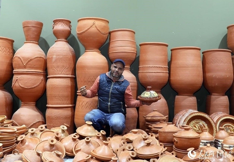 塔吉锅是摩洛哥传统美食,类似中国的瓦罐炖肉。锅用陶土制成,锅盖如塔。图为一名商贩展示塔吉锅。人民网舒艾卜·布拉达摄